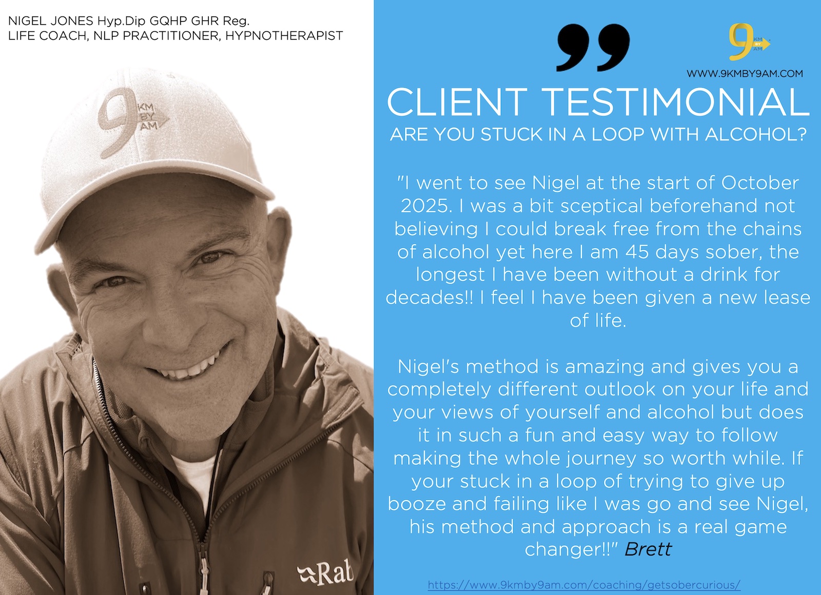 “I went to see Nigel at the start of October 2025. I was a bit skeptical beforehand not believing I could break free from the chains of alcohol yet here I am 45 days sober, the longest I have been without a drink for decades!! I feel I have been given a new lease of life. Nigel’s method is amazing and gives you a completely different outlook on your life and your views of yourself and alcohol but does it in such a fun and easy way to follow making the whole journey so worth while. If your stuck in a loop of trying to give up booze and failing like I was go and see Nigel, his method and approach is a real game changer!!” Brett Fewell