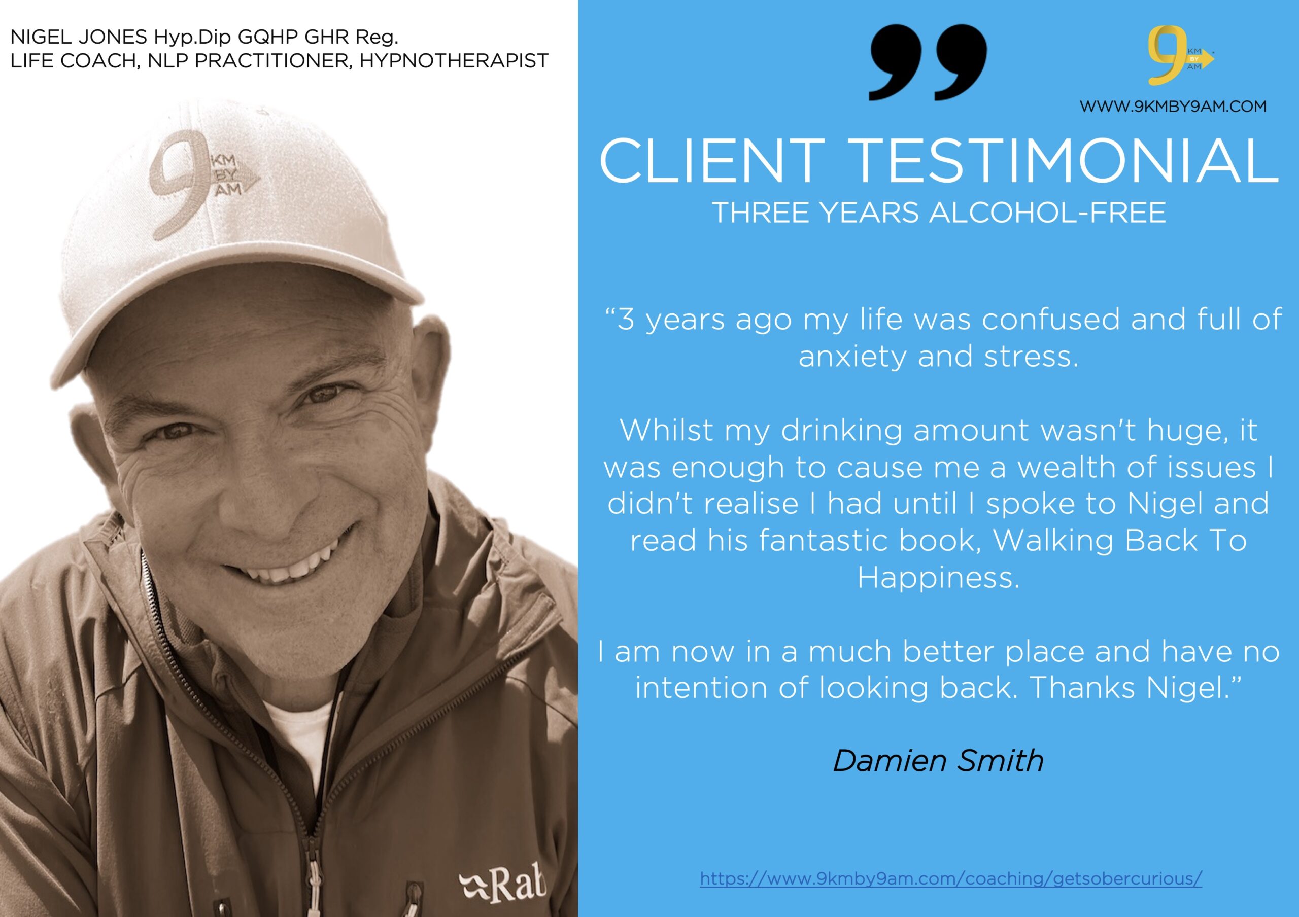 “Really enjoyed my AF coaching sessions with Nigel! I went into the initial session rather sceptical as I had had AF coaching before and was still struggling with the same issues. However, I came out of that session feeling like a huge weight had been lifted off my shoulders again! I feel like I am going to break a huge barrier, one that not only impacts on work life but my personal life too. I honestly can’t tell you how much I get from these sessions and Nigel’s passion for AF is highly infectious. Would highly recommend these coaching sessions for anyone needing to deep dive into their relationship with alcohol. His book ‘Walking Back to Happiness’ is packed with helpful and relatable tips and hacks. Would highly recommend Nigel’s coaching sessions.” CLAIRE, UK