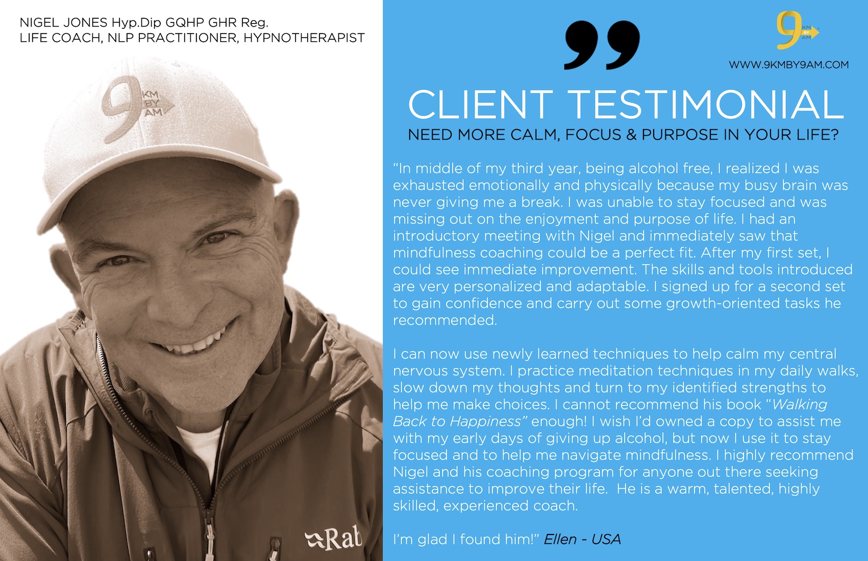 I can honestly say I would not be where I am today if it were not for Nigel and his experience, knowledge, and his coaching work. So, if you feel like coaching would benefit you like it did me, but you’re unsure about taking this next step I would recommend these coaching sessions with Nigel as a step in the right direction in your alcohol free life to enable you to progress into a better you.