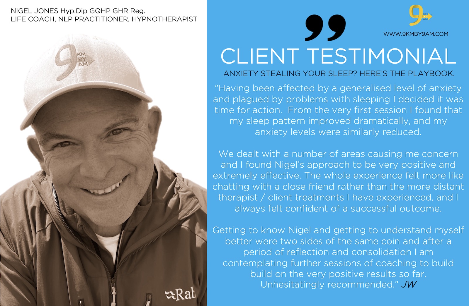“Having been affected by a generalised level of anxiety and plagued by problems with sleeping I decided it was time for action. I had an initial consultation with Nigel and we agreed to a program of 6 sessions to discuss and deal with the issues. From the very first session I found that my sleep pattern improved dramatically, and my anxiety levels were similarly reduced. We dealt with a number of areas which were causing me concern and I found Nigel’s approach to be very positive and extremely effective. The whole experience felt more like chatting with a close friend rather than the more distant therapist/client treatments I have experienced in the past, and I always felt confident of a successful outcome. From my perspective, getting to know Nigel and getting to understand myself better were two sides of the same coin and after a period of reflection and consolidation I am contemplating further sessions of coaching which will build on the very positive results so far. Unhesitatingly recommended.” JW, UNITED KINGDOM